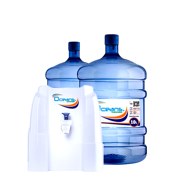 1 dispensador sobremesa temperatura ambiental + 2 envases retornables y Agua Purificada OCEANS 10L