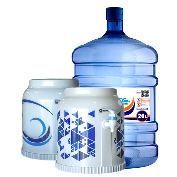 1 dispensador de agua sobremesa temperatura ambiental + 1 envase retornable y agua purificada OCEANS 20 litros | Color Blanco con diseño azul